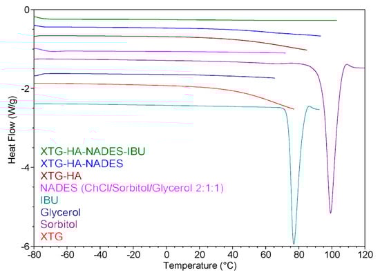 Choosing the right polymeric components is essential for optimizing eutectogel performance. Xanthan gum (XTG) and hyaluronic acid (HA) are two biopolymers extensively studied and employed in pharmaceutical formulations due to their complementary and synergistic properties [39,40]. XTG, a high-molecular-weight polysaccharide derived from Xanthomonas campestris through microbial fermentation, is well known for its high viscosity, stability across a broad pH range, and shear-thinning behavior [41]. These properties make XTG an ideal candidate for creating a stable and spreadable gel matrix that can support and enhance the delivery of APIs.