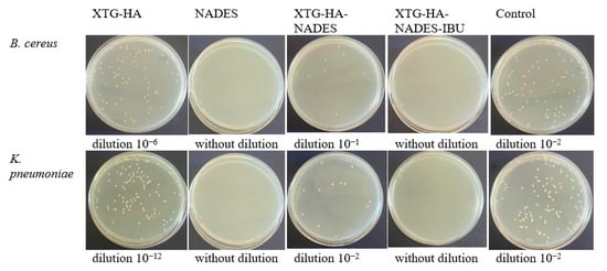 Given the potential of NADES-based eutectogels for mucosal drug delivery, this study aims to develop a novel hybrid eutectogel formulation to address buccal inflammatory conditions complicated by bacterial infections. The proposed system employs XTG and HA as gelling agents, a ternary NADES system (choline chloride/sorbitol/glycerol 2:1:1), and IBU as the active pharmaceutical ingredient. We employ a systematic optimization strategy focused on achieving desirable rheological, textural, and kinetic properties. Moreover, since oral inflammatory conditions are often exacerbated by microbial colonization [44], the dual advantage of this system lies in its potential antimicrobial as well as anti-inflammatory activity. We tested the hybrid eutectogels against Gram-positive (Bacillus cereus, Enterococcus faecium) and Gram-negative (Klebsiella pneumoniae) bacteria, chosen for their relevance to the oral cavity and for their distinct cell envelope structures, which can impede drug penetration [45]. By demonstrating inhibitory activity against representative strains from both groups, the eutectogels hold promise for broader therapeutic use where infection risk is high.