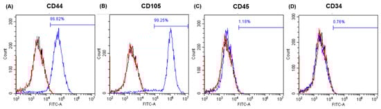 Phenotypic characterisation of hAdMSCs by flow cytometry. The red histograms represent the positive cells out of the total cells analysed (blue line). Negative isotype controls are marked in black. Human AdMSCs were positive for (A) CD44 and for (B) CD105 and negative for (C) CD45 and for (D) CD34, respectively.