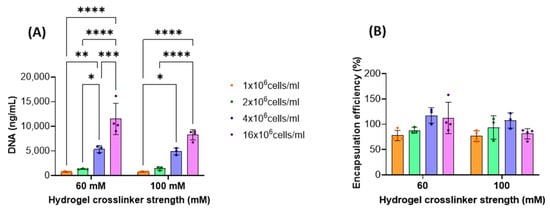 (A) DNA content at 24 h after hAdMSC seeding at different cell densities and hydrogel strengths. Data are reported as mean ± SD (n = 3). A statistical analysis was carried out between the samples at each cell densities and stiffness by Two-way ANOVA, followed by Sidak’s multiple comparison test (* p < 0.05, ** p < 0.01, *** p < 0.001, and **** p < 0.0001). (B) Encapsulation efficiency, calculated from the DNA quantity retrieved on day 1 from the gels in comparison to the DNA quantity retrieved from cells cultured in 2D and seeded at the same seeding density. Data are reported as mean ± SD (n ≥ 3). Data were analysed by Two-way ANOVA (p > 0.05).