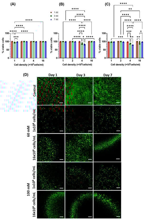 Percentage of viable cells in hydrogels on days 1, 3 and 7 using different seeding densities: (A) 2D culture plastic; (B) hydrogel crosslinked with 60 mM CaCl2; (C) hydrogel crosslinked with 100 mM CaCl2. Data are reported as mean ± SD (n = 3). A statistical analysis was carried out between the samples at each cell densities and stiffness by Two-way ANOVA, followed by Sidak’s multiple comparison test (* p < 0.05, ** p < 0.01, ***p < 0.001, and **** p < 0.0001). (D) Representative live and dead images of hAdMSCs seeded at 1 × 106 and 16 × 106 cells/mL density. Scale bar: 265 µm.