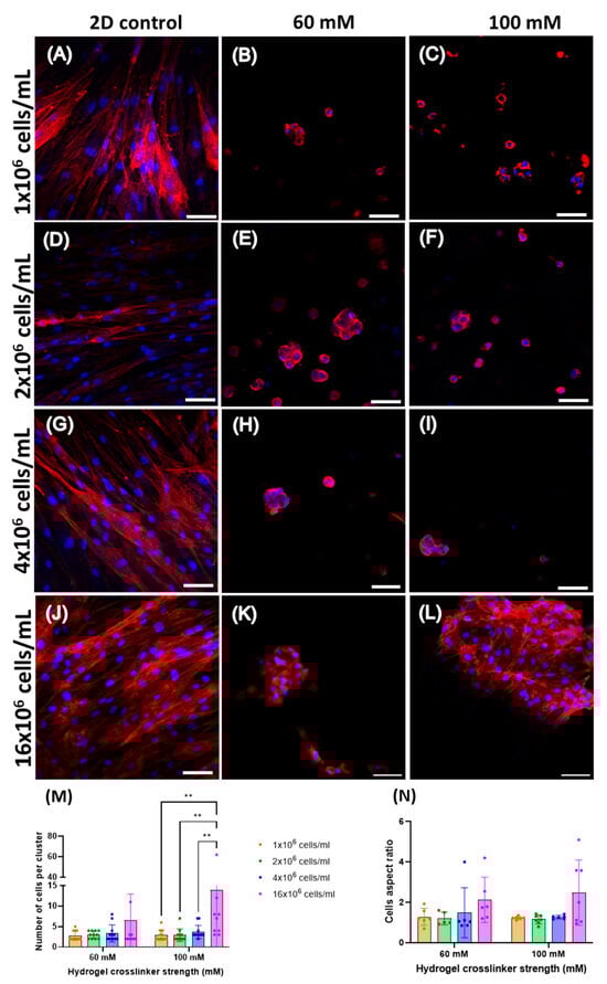Morphological characterisation (phalloidin and DAPI) of hAdMSCs on day 7 grown in 2D and in hydrogels of two different stiffnesses: 60 mM and 100 mM. The images of hAdMSCs in 2D are shown at increasing cell densities, from to the top to the bottom, in the first column: (A) 1 × 106 cells/mL, (D) 2 × 106 cells/mL, (G) 4 × 106 cells/mL, and (J) 16. × 106 cells/mL. Similarly, the cells in gels obtained with 60 mM CaCl2 are shown in the second column from top to bottom: (B) 1 × 106 cells/mL, (E) 2 × 106 cells/mL, (H) 4 × 106 cells/mL, and (K) 16 × 106 cells/mL. Finally, hAdMSCs, within hydrogels obtained with 100 mM CaCl2, are shown in the third column from top to bottom: (C) 1 × 106 cells/mL, (F) 2 × 106 cells/mL, (I) 4 × 106 cells/mL, and (L) 16. × 106 cells/mL. Scale bar was 66.25 µm. (M) Average number of cells per cluster in hydrogels of two different stiffnesses and four cell densities on day 7. The results are shown as a mean ± SD (n ≥ 3). A statistical analysis was carried out between the samples at each cell densities and stiffness by Two-way ANOVA (** p < 0.01). (N) An aspect ratio analysis comparing cells within hydrogels of different stiffnesses and cell seeding densities. Error bars denote standard deviation, n ≥ 3. The comparison between groups was assessed by Two-way ANOVA, followed by Sidak’s multiple comparison test (p > 0.05).