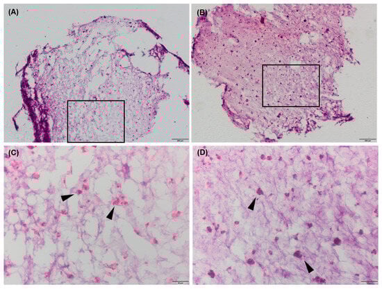 H&E staining of (A) 60 and (B) 100 mM hydrogels encapsulating hAdMSCs (16 × 106 cells/mL) (scale bar, 200 µm). Purple nuclei were stained with haematoxylin, whereas the cytoplasm and extracellular matrix were stained with eosin. The magnified areas (C,D) show the presence of cell aggregates (arrows) evenly distributed within the sections (scale bar, 50 µm).