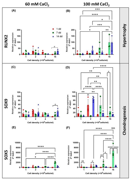 Effect of different cell seeding densities on the gene expression of RUNX2 (A,B), SOX9 (C,D), and SOX5 (E,F) of hAdMSCs within hydrogels of different stiffnesses (crosslinked with either 60 or 100 mM CaCl2) on days 1, 7, and 14. Messenger RNA data are presented as fold change expression relative to the 2D controls grown with a basal medium. The results are presented as a mean ± SD (n ≥ 3). The comparison among groups was assessed by ordinary Two-way ANOVA, followed by Sidak’s multiple comparison test. * indicated the effect of cell seeding density with * p < 0.05, ** p < 0.01, *** p < 0.001, **** p < 0.0001; # indicates the effect of time with # p < 0.05, ## p < 0.001 and #### p < 0.0001 $ indicates comparison between the gels of two different stiffnesses with $ p < 0.05, $$$ p < 0.001.