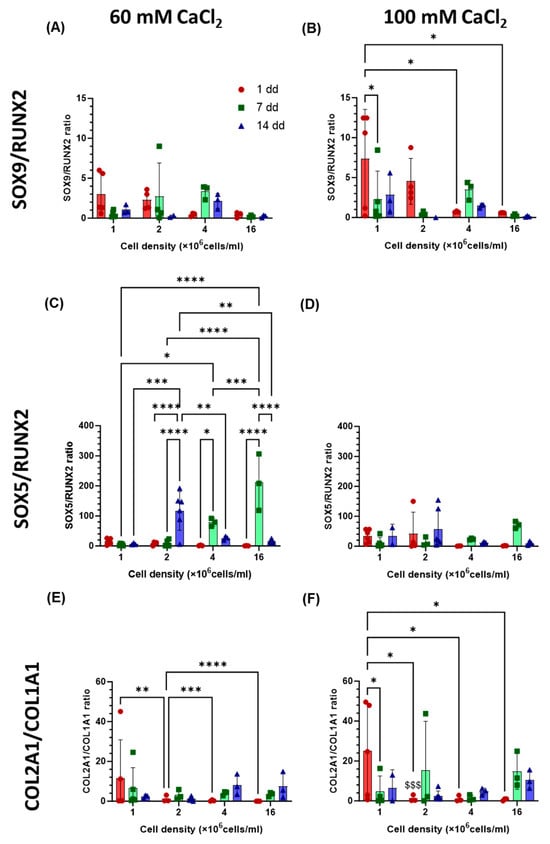 Effect of different cell seeding densities on the gene expression of COL1A1 (A,B), COL2A1 (C,D), and ACAN (E,F) of hAdMSCs within hydrogels of different stiffnesses (crosslinked with either 60 or 100 mM CaCl2) on days 1 (red), 7 (green), and 14 (purple). Messenger RNA data are presented as fold change expression relative to the 2D controls grown with a basal medium. The results are presented as a mean ± SD (n ≥ 3). The comparison among groups was assessed by ordinary Two-way ANOVA, followed by Sidak’s multiple comparison test. * p < 0.05, ** p < 0.01, *** p < 0.001, **** p < 0.0001, $ indicates a comparison between the two gels with $ p < 0.05.