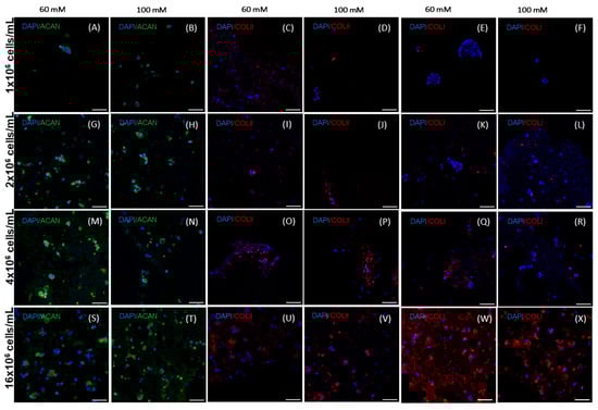 Representative immunohistochemical images of aggrecan (ACAN), collagen type II (COL2), and collagen type I (COL1) of hAdMSCs within hydrogels (60 mM and 100 mM) at different cell densities. The first row shows hAdMSCs cultivated at a cell density equal to 1.0 × 106 cells/mL, the second row equal to 2.0 × 106 cells/mL, the third row equal to 4.0 × 106 cells/mL, and the fourth row equal to 16.0 × 106 cells/mL. Aggrecan staining for the 60 mM hydrogels (A,G,M,S) and for the 100 mM ones (B,H,N,T). Collagen II staining for the 60 mM hydrogels (C,I,O,U) and for the 100 mM ones (D,J,P,V). Collagen I staining for the 60 mM hydrogels (E,K,Q,W) and for the 100 mM ones (F,L,R,X). The scale bar is 66 µm.