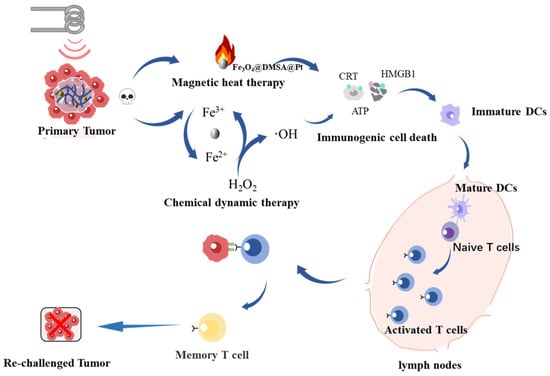 Notably, magnetothermal therapy (MHT) and CDT individually induce immunogenic cell death (ICD) [20], a highly regulated cell death process characterized by the sequential release of damage-associated molecular patterns (DAMPs) including calreticulin (CRT), high-mobility group box 1 protein (HMGB1), and adenosine triphosphate (ATP) [21,22]. Recent advancements in ICD-inducing nanotherapies focus on engineering nanoparticles to enhance DAMP release via redox modulation. For example, researchers led by Wang et al. reported that that ER-targeted iron oxide nanoparticles conjugated with GRP78-binding peptides significantly augmented CRT exposure and ATP secretion compared to conventional ICD inducers under acidic tumor microenvironments, while minimizing systemic toxicity through pH-responsive drug release [23]. Similarly, a study by Wang et al. demonstrated a pH-responsive nanoplatform combining doxorubicin and photosensitizers, which induced increased ATP secretion and dendritic cell maturation in vitro [24].Importantly, recent studies have shown that integrating ICD-inducing nanotherapies with immune checkpoint blockade (e.g., PD-1/PD-L1 inhibitors) significantly enhances tumor regression, with some platforms achieving complete tumor suppression in 80–100% of treated mice [25,26]. Despite these breakthroughs, magnetic hyperthermia with ICD induction remains underexplored in DLBCL treatment.