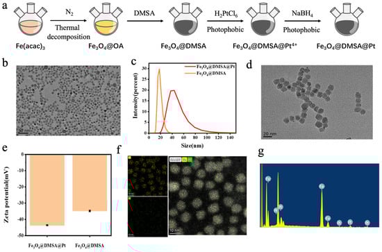(a) Schematic illustration of the preparation process of Fe3O4@DMSA@Pt nanoparticles. (b) Transmission electron microscopy (TEM) image of Fe3O4@OA. (c) Hydrodynamic size profiles of Fe3O4@DMSA and Fe3O4@DMSA@Pt. (d) TEM image of Fe3O4@DMSA@Pt. (e) Zeta potential profiles of Fe3O4@DMSA and Fe3O4@DMSA@Pt. (f) Mapping characterization of Fe3O4@DMSA@Pt. (g) Energy-dispersive spectroscopy (EDS) of Fe3O4@DMSA@Pt.