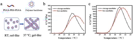 (a) Transition mechanism of PLGA-PEG-PLGA block copolymer hydrogel. (b) Rheological characterization of PLGA-PEG-PLGA block copolymer. (c) Rheological characterization of the composite magnetic thermosensitive hydrogel Fe3O4@DMSA@Pt@PLGA-PEG-PLGA.