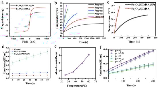 (a) Hysteresis regression curves of Fe3O4@DMSA and Fe3O4@DMSA@Pt. (b) Magnetothermal heating-up curves of Fe3O4@DMSA nanoparticles with different concentrations. (c) Magnetothermal heating-up curves of 7 mg/mL Fe3O4@DMSA and Fe3O4@DMSA@Pt. (d) POD-like activities of Fe3O4@DMSA@Pt and Fe3O4@DMSA. (e,f) Effects of temperature and pH on the POD-like activity of Fe3O4@DMSA@Pt nanoparticles.