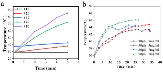 (a) Magnetothermal heating curves of Fe3O4@DMSA@Pt@PLGA-PEG-PLGA composite hydrogels with different volumes. (b) Magnetothermal heating curves of Fe3O4@DMSA@Pt@PLGA-PEG-PLGA composite hydrogels with different concentrations.