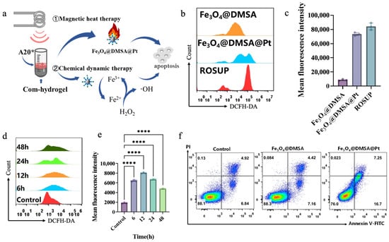 (a) Schematic illustration of the synergistic mechanisms of magnetic heat therapy and chemical dynamic therapy in the com-hydrogel on A20 cells for inducing apoptosis. (b) Flow-cytometry analysis of ROS levels in A20 cells treated with Fe3O4@DMSA and Fe3O4@DMSA@Pt. (c) Comparison of mean fluorescence intensity of ROS in A20 cells treated with Fe3O4@DMSA, Fe3O4@DMSA@Pt and ROSUP positive control. (d) Time-dependent ROS generation in A20 cells treated with Fe3O4@DMSA@Pt analyzed by flow cytometry. (e) Quantification of mean fluorescence intensity of ROS over time in A20 cells treated with Fe3O4@DMSA@Pt. (f) Flow-cytometry analysis of A20 cell apoptosis in the control group and groups treated with Fe3O4@DMSA and Fe3O4@DMSA@Pt using Annexin V-FITC/PI staining. Pseudocolour plots build upon scatter plots by adding heat-map like colors. The shades of these colors show the cell density. Warmer tones like red denote regions with high cell density. Cooler tones such as blue or lighter colors represent regions with low cell density, indicating fewer cells. Bars means ± S.D. **** p < 0.0001, n = 3.