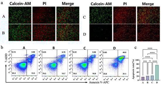 To further examine the magnetothermal synergistic chemokinetic tumor-killing effect of the composite injectable hydrogel Fe3O4@DMSA@Pt@PLGA-PEG-PLGA at the cellular level, four groups were defined: Group A (untreated A20 cells), Group B (A20* + Com-hydrogel at 37 °C for chemodynamic therapy [CDT] alone), Group C (A20* + Com-hydrogel heated to 42 °C by AMF, integrating magnetothermal therapy [MHT] and CDT), and Group D (A20* + Com-hydrogel heated to 50 °C by AMF, combining MHT and CDT). Live/dead staining (Figure 7a) showed Group B (CDT alone) had slightly more cell death than the control, while Groups C and D (MHT + CDT) exhibited markedly increased cell death—especially Group D at 50 °C, which caused near-complete killing. Flow cytometry (Figure 7b,c) indicated Group B’s apoptosis rate was 1.23 times higher than the control; Group C’s exceeded Group B by only 12% (suggesting 42 °C lacked full synergy), while Group D at 50 °C achieved a 75.9% apoptosis rate, 3.71 times higher than Group B.