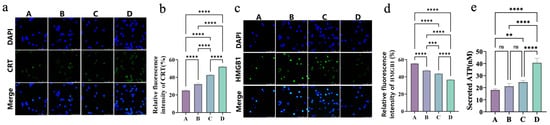 (a) Immunofluorescence staining images of CRT and merged images with DAPI staining in different groups (A–D). (b) Quantitative analysis of relative fluorescence intensity of CRT in different groups (A–D). (c) Immunofluorescence staining images of HMGB1 and merged images with DAPI staining in different groups (A–D). (d) Quantitative analysis of relative fluorescence intensity of HMGB1 in different groups (A–D). (e) Quantification of secreted ATP levels in different groups (A–D). Bars means ± S.D. ** p < 0.01, *** p < 0.001, **** p < 0.0001, ns: not significant. n = 3.