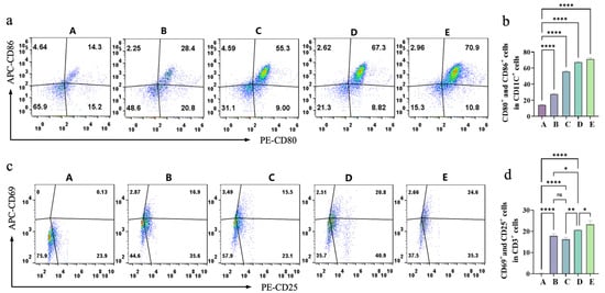 (a) Flow-cytometry analysis of CD80+ and CD86+ cells in different groups (A–E) presented as dot plots. (b) Quantitative analysis of the percentage of CD80+ and CD86+ cells in different groups (A–E). (c) Flow-cytometry analysis of CD25+ and CD69+ cells in different groups (A–E) presented as dot plots. (d) Quantitative analysis of the percentage of CD25+ and CD69+ cells in different groups (A–E). Pseudocolour plots build upon scatter plots by adding heat-map like colors. The shades of these colors show the cell density. Warmer tones like red denote regions with high cell density. Cooler tones such as blue or lighter colors represent regions with low cell density, indicating fewer cells. Bars means ± S.D. * p < 0.05,** p < 0.01, **** p < 0.0001, ns: not significant. n = 3.