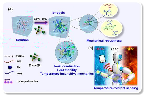 (a) Fabrication of tough, temperature-resistant, and conductive nanocomposite ionogels and (b) conductive nanocomposite ionogels may be utilized as sensors for monitoring both minor and significant human movements and temperature-resilient (−20 to 80 °C) pressure detection. Reprinted with permission from [63].
