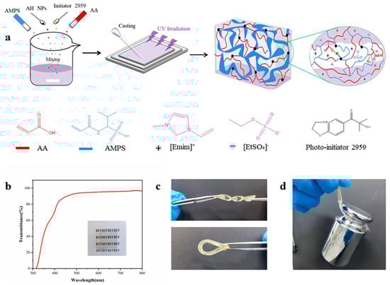 Preparation of the nanocomposite ionogels. (a) Schematic illustration of ionogel preparation via one-step photopolymerization. (b) Transmittance spectra of AP80Al12E with a film thickness of 1.7 mm. Illustration: photograph showing the high transparency of the film. (c) Photographs of an ionogel stretching and twisting. (d) Photograph of the ionogel (40 × 3 × 1.7 mm) supporting a 1 kg weight. Reprinted with permission from [75].