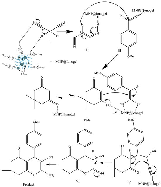 Based on the proposed mechanism, we posit that the synthesized magnetic ionogel catalyst facilitates both the Knoevenagel condensation reaction and the Michael addition [77]. The nucleophilic addition of an activated compound to a carbonyl group (intermediates II–III), followed by a Michael addition (intermediate IV) of a nucleophile to an α,β-unsaturated carbonyl compound, has resulted in the formation of the product (Figure 4).