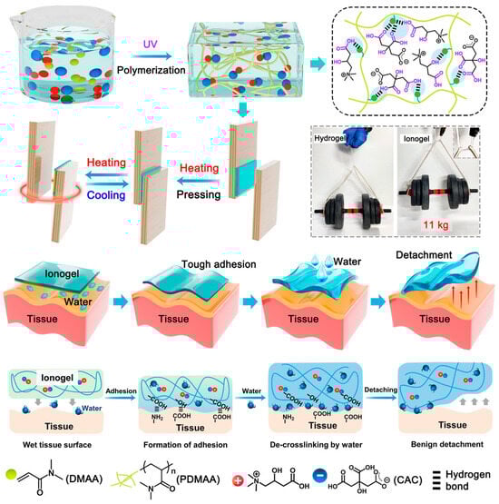 Ionogel structure and supramolecular interaction. Ionogels were made by polymerizing CAC and DMAA. The liquids and polymer chains formed a dense supramolecular network due to the number of hydrogen bonding sites, creating a robust ionogel (CAC content: 45 wt%) that can bear 11 kg. The generated ionogel balances intermolecular cohesion energy with interfacial adhesion energy, generating a strong adhesion with substrates and allowing heating/cooling. Hydrogen bonding interactions can crosslink the ionogel to the tissue surface for mechanically matched strong adherence. Finally, the damaged reversible bonds allow a saline solution to gently remove the ionogel [89].
