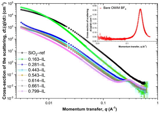 SAXS data for the OMIM BF4@SiO2 ionogels, SiO2-ref sample and bare OMIM BF4 ionic liquid (inset). Reprinted with permission from [93].
