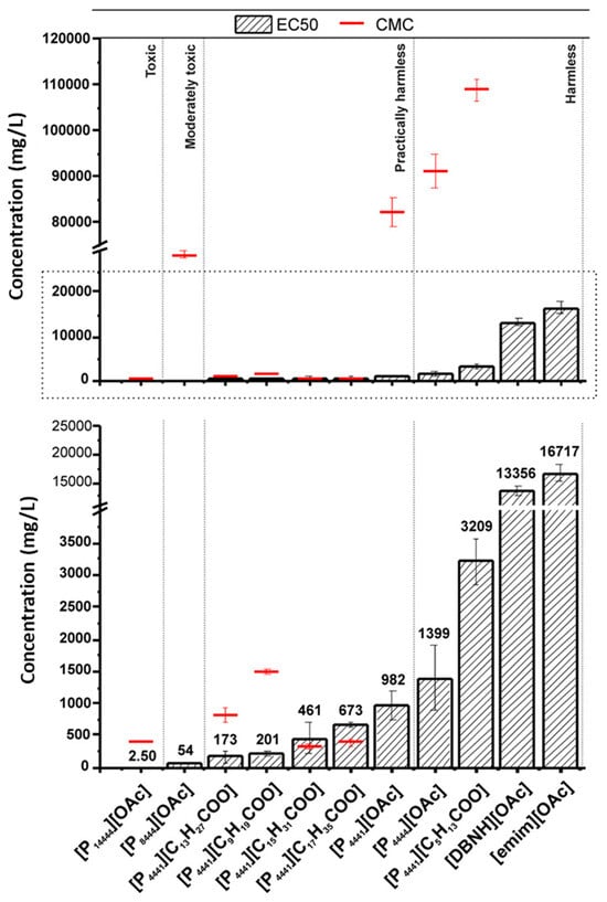 IL cellular toxicity on CHO cells—EC50s and CMCs. A 2 h alamarBlue assay was used to assess the cytotoxicity after 24 h of incubation with the identified ILs at varying doses. Upper figure’s designated area is increased in the lower figure [101].