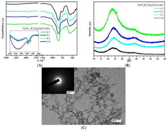 IR spectra (A) and XRD patterns (B) of aerogels, obtained using different molar ratios of the precursors. Microphotograph and SAED pattern (inlet) of the aerogel prepared using the ratio of GeCl4:(C2H5)2GeCl2 = 1:1 (C).