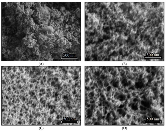 The aerogel obtained in the absence of (C2H5)2GeCl2 consists primarily of nanoparticles, with inclusions of larger agglomerates with size up to several hundred nanometers (Figure 2A). Such inclusions do not form if (C2H5)2GeCl2 is present in the reaction (Figure 2B–D). Addition of (C2H5)2GeCl2 does not significantly affect the particle size, but an increase in its proportion leads to the formation a more developed 3D-structure with larger pores and channels.