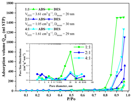 Nitrogen adsorption-desorption isotherms of the GeO2 aerogels belong to Type 3 according to IUPAC with H2(b) type hysteresis in the case of the 1:1 ratio aerogel and with H3 type in the case of the 2:1 and 4:1 ratio aerogels (Figure 4). The pore size distributions calculated using the Barrett–Joyner–Halenda model indicate the presence of 10–30 nm mesopores in all samples. In the aerogels prepared with 2:1 and 4:1 precursor ratio, some macropores with size above 50 nm are present, though the bigger fraction of pores remains in the 15–30 nm range. The cumulative pore volume for all samples lies within 1.05–3.61 cm3/g. The largest cumulative pore volume is characterized for the aerogel prepared with 1:1 precursor ratio, which agrees well with SEM data (Figure 2D).