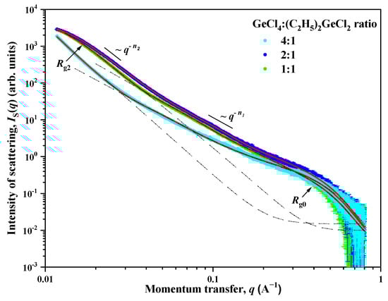 In samples prepared with a molar ratio of GeCl4:(C2H5)2GeCl2 = 2:1 and 1:1, a deviation from the q−n2 power dependence is observed in the region of small q. This deviation indicates the presence of large-scale inhomogeneities (aggregates) with a characteristic size of the Rc2. The absence of this deviation for a sample with a molar ratio of 4:1, in turn, means that the characteristic size of Rc2 exceeds the maximum size of inhomogeneities Rmax ≈ 3.5/qmin [28], the scattering from which can be recorded experimentally at a given resolution of the device. In the case of the SAXS device used for the study, it is qmin = 0.01 Å−1 and Rc2 > Rmax ≈ 350 Å.