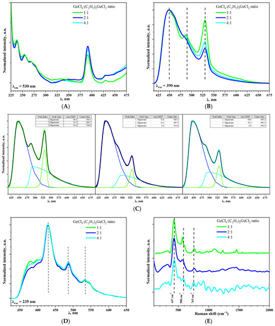 The photoluminescence excitation spectra of aerogel samples prepared with different molar ratios of precursors GeCl4:(C2H5)2GeCl2 recorded at 530 nm (A). The photoluminescence spectra of aerogel samples prepared with different molar ratios of precursors GeCl4:(C2H5)2GeCl2 at λexc= 390 (B) and 235 (D) nm. Bi-Gaussian decomposition of spectrum, presented in Figure 7B (C). Raman spectra of aerogel samples prepared with different molar ratios of precursors GeCl4:(C2H5)2GeCl2 (E).