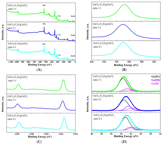 XPS survey spectra (A) and O1s (B), Ge2p (C) and Ge3d (D) XPS spectra of aerogel samples prepared with different molar ratios of precursors GeCl4:(C2H5)2GeCl2.