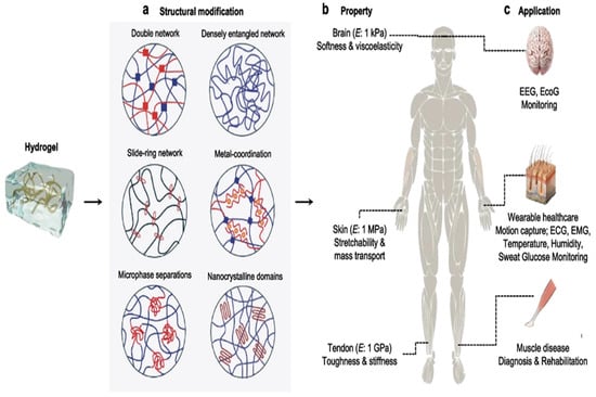 Approaches for modifying hydrogel properties and their use in bioelectronics. (a) Strategies for designing the network structure of hydrogels. (b) Mechanical characteristics of hydrogels that align with the properties of various human tissues. (c) Bioelectronic applications of hydrogels with customized properties, including electromyography, electroencephalography, electrocardiography, and electrocorticography. Reproduced from Ref. [61] under the Creative Commons Attribution 4.0 International License.