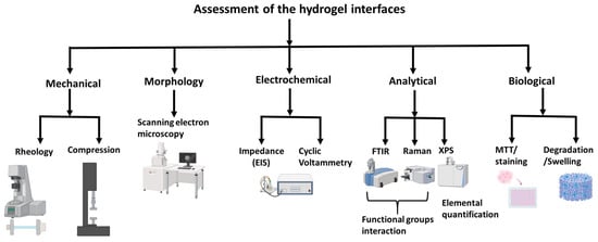 Evaluation and assessment of the hydrogel biointerfaces, including mechanical testing, morphological analysis, electrochemical assessments, chemical composition, biocompatibility, and stability studies.