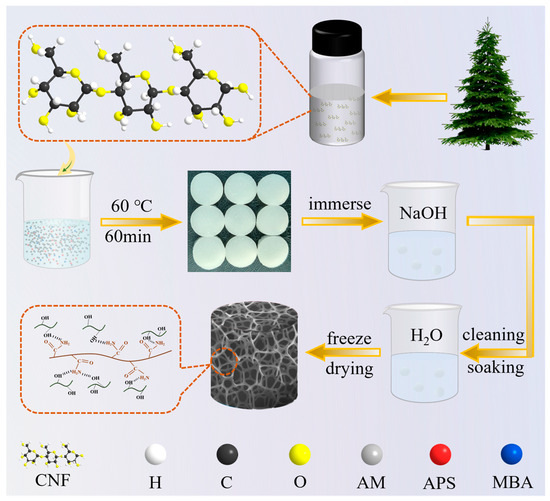 In our previous research, we successfully prepared a cellulose nanofibril (CNF) with a solid concentration of 8%, which was used in this study. The details of the preparation method and characterisation are provided in Reference [33]. Polyacrylamide (PAM) was purchased from Fuchen Chemical Reagent Co., Ltd. (Tianjin, China), whilst N, N-methylene acrylamide (MBA), and ammonium persulfate (APS) were procured from Shanghai Aladdin Biochemical Technology Co., Ltd. (Shanghai, China), and sodium hydroxide (NaOH) was obtained from Tianli Chemical Reagent Co., Ltd. (Tianjin, China), while methylene blue (MB) and hydrochloric acid (HCl) were obtained from Guangfu Chemical Reagent Co., Ltd. (Tianjin, China). All chemicals utilised in this study were of analytical grade, thus obviating the necessity for further purification. Deionised water was used throughout this study.