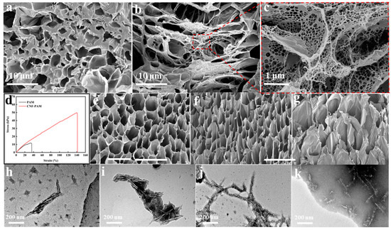 Scanning electron micrographs (SEM) of PAM (a); CNF-PAM (b); CNF-PAM localised magnification (c); stress–strain diagram of gels (d); CNF-PAM1% (e); CNF-PAM5% (f); and CNF-PAM10% (g). Transmission electron micrographs (TEM) of CNF (h). CNF was subjected to treatment with varying concentrations of NaOH, specifically 1%, 5%, and 10% (i–k).