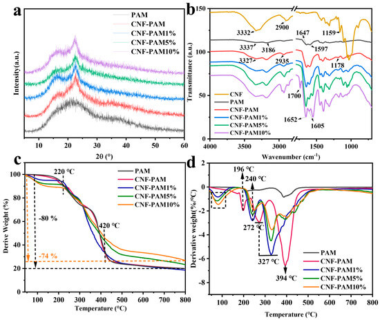 Thermogravimetric (TG) and derivative thermogravimetric (DTG) analyses were conducted on both the CNF-PAM and the NaOH-treated CNF-PAM, with the results presented in Figure 3c and Figure 3d, respectively. From the TG curves, it is evident that the decomposition of the NaOH-treated samples occurs more prominently at lower temperatures (~220 °C) compared to PAM and the CNF-PAM. Additionally, the extent of decomposition increases with higher concentrations of NaOH. However, after 420 °C, the mass loss of the gel decreased with the increasing NaOH treatment concentration. From Figure 3c, it can be observed that the mass loss rates of PAM and the CNF-PAM are nearly identical, indicating that the addition of CNF does not significantly affect the thermal stability of PAM. Specifically, at 800 °C, the mass loss rate of the CNF-PAM is approximately 80%, while that of the CNF-PAM10% is 74%. These findings suggest that the NaOH-treated gels exhibit satisfactory thermal stability. Figure 3d illustrates a more complex pyrolysis profile, with a minor degradation peak occurring around 150 °C attributed to water loss, marking the initial stage of the degradation process. Subsequently, a degradation peak appeared at 196 °C, which was mainly due to the degradation of the glucose/glucuronide copolymer molecular chains in the amorphous region of the CNF and the degradation in the crystalline region [41,42], followed by the beginning of the decomposition of the main chains in the PAM. When treated with NaOH, the rate of degradation was significantly reduced and the peak shifted to 240 °C, indicating the onset of the second stage of degradation. The third stage primarily occurs within the temperature range of 272–327 °C, with pyrolysis peaks shifting towards higher temperatures. These changes in pyrolysis behaviour indicate that the chemical structure of the CNF-PAM gels following the NaOH treatment exhibits greater stability, thereby enhancing their thermal stability [43].