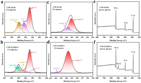 In addition, XPS spectroscopic analyses were conducted on the CNF-PAM and the CNF-PAM5% to examine the chemical changes induced by the NaOH treatment. As illustrated in Figure 4a, the C 1s spectrum of the CNF-PAM comprises three distinct peaks: C–C (284.80 eV), C–N (286.30 eV), and C=O/C=N (287.92 eV). Compared to the CNF-PAM, the CNF-PAM5% (Figure 4b) exhibited an O–C=O peak at 288.10 eV, which can be attributed to the carboxylic acid groups formed through the hydrolysis of the CNF-PAM. The presence of two peaks, amino N (399.07 eV) and amide N (399.65 eV), on the surface of the CNF-PAM (Figure 4c), along with the overall leftward shift in binding energy after the NaOH treatment (Figure 4d), further confirms the hydrolysis of the CNF-PAM. Meanwhile, the presence of elemental Na on the surface of the CNF-PAM5%, as evidenced by a comparison of the survey spectra (Figure 4e,f), suggests that the CNF-PAM5% underwent hydrolysis and reacted with NaOH to form sodium carboxylate. However, no distinct characteristic peaks indicative of hydrolysis were observed in the FTIR, suggesting that the hydrolysis of the CNF-PAM at 5% concentration is minimal. This indicates that 5% NaOH concentration may be at the threshold for initiating the CNF-PAM hydrolysis.