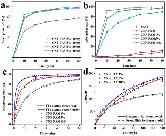 Adsorption rate of MB by the different PAM-CNF5% deliveries (a); variation in the adsorption rate of MB by the gel at different time (b); the pseudo-first-order and the pseudo-second-order kinetic models for MB adsorption by gels (c); adsorption data fitted to the Langmuir and Freundlich isotherm models (d).