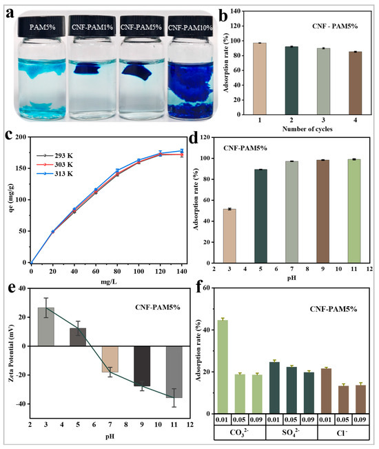 State of different gels after 60 min of adsorption (a); cyclic adsorption performance of MB by the CNF-PAM5% gel (b); influence of varying temperatures on the adsorption of MB by the CNF-PAM5% (c); impact of different pH levels on the adsorption of MB by CNF-PAM5% (d); zeta potential of the CNF-PAM5% at pH values ranging from 3 to 11 (e); effect of interfering anions on the adsorption of MB by the CNF-PAM5% (f).