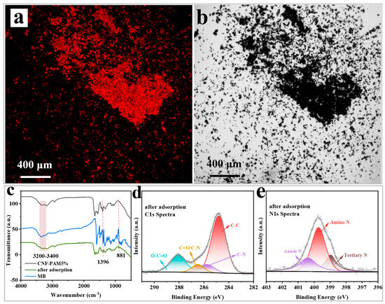 Comparison of CNF-PAM5% under fluorescence microscope after MB adsorption (a,b). FTIR spectra of CNF-PAM5% before and after MB adsorption (c); C 1s high-resolution XPS spectra (d); and N 1s high-resolution XPS spectra (e) after MB adsorption by CNF-PAM5%.