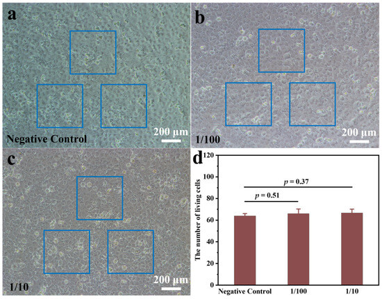 The HPDE cells were treated with a medium containing CNF-PAM5% and observed under the microscope. HPDE cells were cultured in a normal cell culture medium as a negative control for 48 h (a); HPDE cells were cultured in a cell culture medium containing 1/100 v/v CNF-PAM5% for 48 h (b); HPDE cells were cultured in a cell culture medium containing 1/10 v/v CNF-PAM5% for 48 h (c); Randomly select three areas of the same size from the microscope field of view as three repeated experiments, observe and count the number of live cells in (a–c). The calculation of the p-value is based on the Student’s t-test. bar = 200 μm (d).