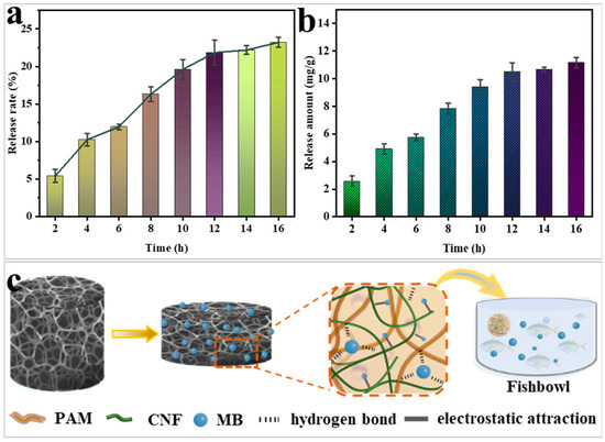 As demonstrated in Figure 9a,b, the gel exhibits a gradual release of MB following the completion of adsorption. As the release time reached 12 h, the release rate of MB was found to be 21.9%, with a release amount of 10.5 mg/g. There was no significant increase in the release rate in the following time. The aforementioned phenomenon can be attributed to two factors. Firstly, the aqueous solution of MB becomes alkaline. Secondly, when the adsorbed gel is immersed in deionised water, the difference in solution concentration results in the dislodgement of the poorly adsorbed MB. The weak change in pH also affects the surface charge of the gel, leading to the detachment of MB. This is the reason why the release almost stops after 16 h. The specific adsorption-release mechanism is illustrated in Figure 9c. It is well known that MB is an effective fish fungicide, but there are strict requirements on the dosage of MB. In this study, the gel was first repeatedly adsorbed with MB to maximise its utilisation efficiency and then released into the fish tank as a fish fungicide, and the slow-release process not only controlled the dosage of MB but made it easier to observe the state of the fish as the MB dosage was increased. This experimental release utilised a solution with a concentration of 20 mg/L and a volume of 50 mL. The gel adsorbent has the advantage that the concentration of the solution can also be altered to suit the desired biocide delivery. This results in an additional application of merit to the gel adsorbent.