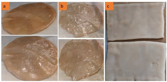 BC films were grown on a Petri dish, as shown in Figure 14a, and in a rectangular plastic box to have large samples in static mode, as shown in Figure 14c. The formation of BC films with a thickness of 2–3 mm on the tea solution’s surface is highlighted in the close-up in Figure 14b.