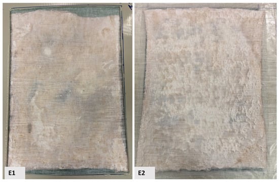 Alternatively, despite employing various surface stabilization methods on BCAs, achieving uniform surface structures remained elusive. The applied stabilization techniques are illustrated in Figure 3 and Figure 4, respectively. The plastic-framed BC film (sample E) exhibits distinct structural characteristics compared to samples composed of NW fabric, which are lighter and less compact, as well as LN2-treated samples, which possess high porosity but reduced density. Its structure is notably compact yet highly porous. The observed surface irregularities on both sides (E1 and E2) in the image suggest potential roughness induced by pre-freezing or drying processes, as evidenced by increased surface crystallization. This roughness may result from conventional freezing methods or physical interactions between the material and the supporting frame.