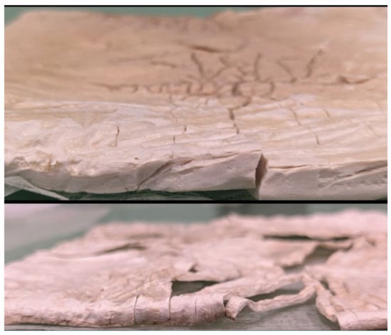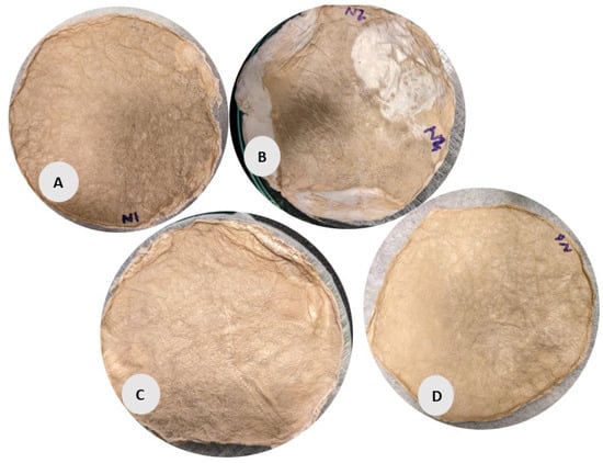Figure 2 presents the freeze–dried BCAs without any form of stabilization, with all samples demonstrating identical conditions and configurations. None of the samples shown in the image underwent form stabilization or pre-freezing with LN2. These represent the initial state prior to the application of form stabilization or pre-freezing with LN2. As depicted in the figure, the BCAs exhibit non-homogeneous surface structures characterized by uneven surfaces with varying thicknesses. Previous studies have compared the visual characteristics of BCA samples dried via oven and lyophilization methods. Vasconcellos et al. and Illa et al. reported that oven-dried samples appeared transparent, whereas freeze–dried samples displayed a foam-like structure resembling Styrofoam while retaining their original shape [11,12]. Consistent with these findings, our results also indicated that freeze–drying preserved the samples’ thickness and foam-like appearance (Figure 2).