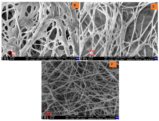 Upon examining the texture of all samples, a randomly arranged fibrous structure was observed. Consistent with previously reported findings, bacterial cellulose aerogels (BCAs) exhibited fine, densely packed fibers that interweave and crisscross, forming fibrils [21,22]. Structural analysis of the studied BC aerogels revealed a three-dimensional network with a porous configuration composed of ultrafine fibers arranged in an unpredictable, ribbon-like pattern. The rapid freezing of the BC aerogels using liquid nitrogen effectively preserved the integrity of the highly porous structure, resulting in aerogels that exhibit an interwoven, crisscrossed pattern, thereby creating a fibril-based three-dimensional arrangement, as depicted in Figure 6 and Figure 7. In contrast, the fiber arrangement in BCAs displayed a more compact structure, with reduced porosity between the fibers in both B and C. Furthermore, both fiber density and inter-fiber porosity were diminished, whereas an increase in fibrillation and porosity was observed in the BCA samples.
