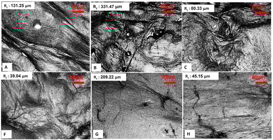 Lyophilized BCAs with conventional pre-freezing according to the sample description in Table 7 and (A–C) with LN2 pre-freezing (F–H). Objective: 20× for all images. Scale bar represents 80 µm. Rz: mean roughness depth.