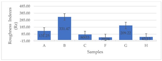 The error bar plot presented in Figure 9 illustrates the variations in mean roughness indices (Rz, μm) among the BCA samples. As shown in Figure 9, the BCA samples subjected to LN2 pre-freezing and those utilizing a structural form exhibited the lowest roughness indices. These findings clearly indicate that the use of a PES NW fabric-covered Petri dish effectively insulated and facilitated uniform heat distribution, as well as consistent moisture removal from the sample. Consequently, this approach resulted in reduced roughness indices.