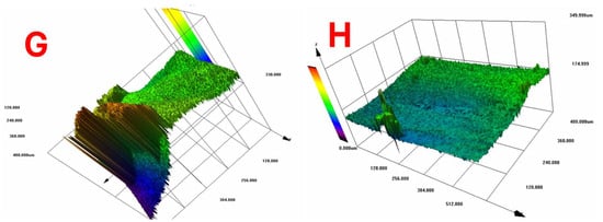 Surface topography of BC films. Conventional vs. LN2 pre-freezing according to the sample description in Table 7: (A–C) stabilized structure of BC with conventional pre-freezing used before lyophilization; (F–H) LN2/fast freezing used before lyophilization.