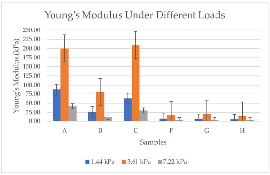 Young’s modulus under different loads for BCA samples according to the sample description in Table 7. (A–C) Conventional pre-freezing samples before lyophilization; (F–H) LN2 pre-freezing samples used before lyophilization.